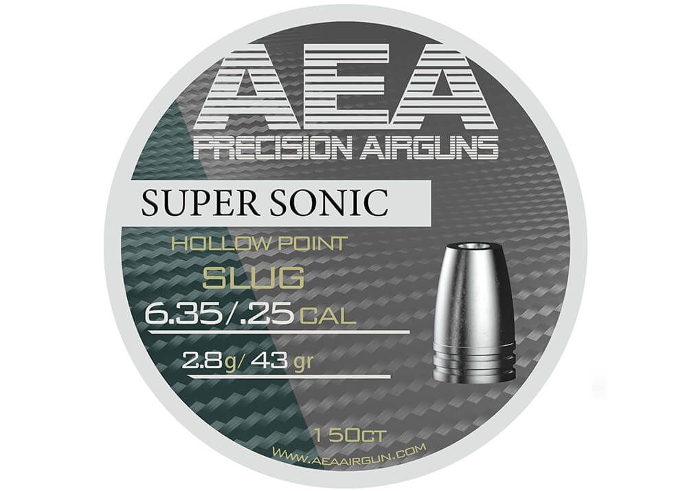 AEA Super Sonic Airgun Slugs Cal. 25 HP 43 grain 150 pc. A heavy 43 grain .25 hollow point slug designed for powerful PCP airguns. Optimized for long-range accuracy and strong terminal impact.