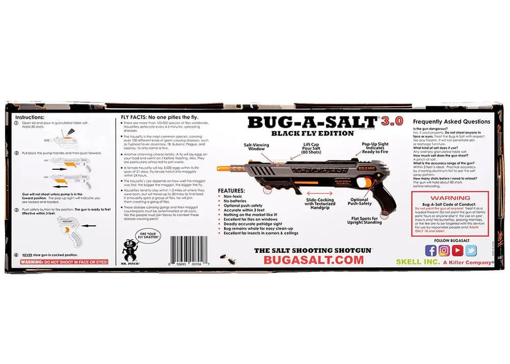 Fantastic spring powered fly swatter to shoot flies, spiders and other creatures you do not want in you home. office or bedroom. Experience fun and effective pest control with the Bug-A-Salt BugBuster Black Fly 3.0, featuring enhanced accuracy, a powerful spring mechanism, and no batteries required.