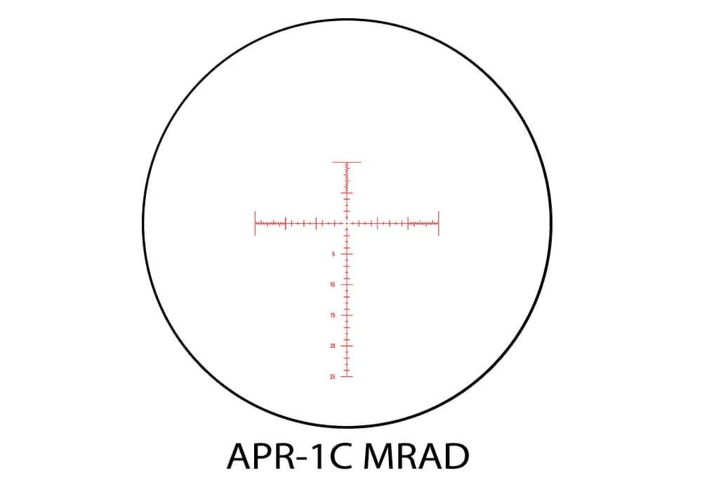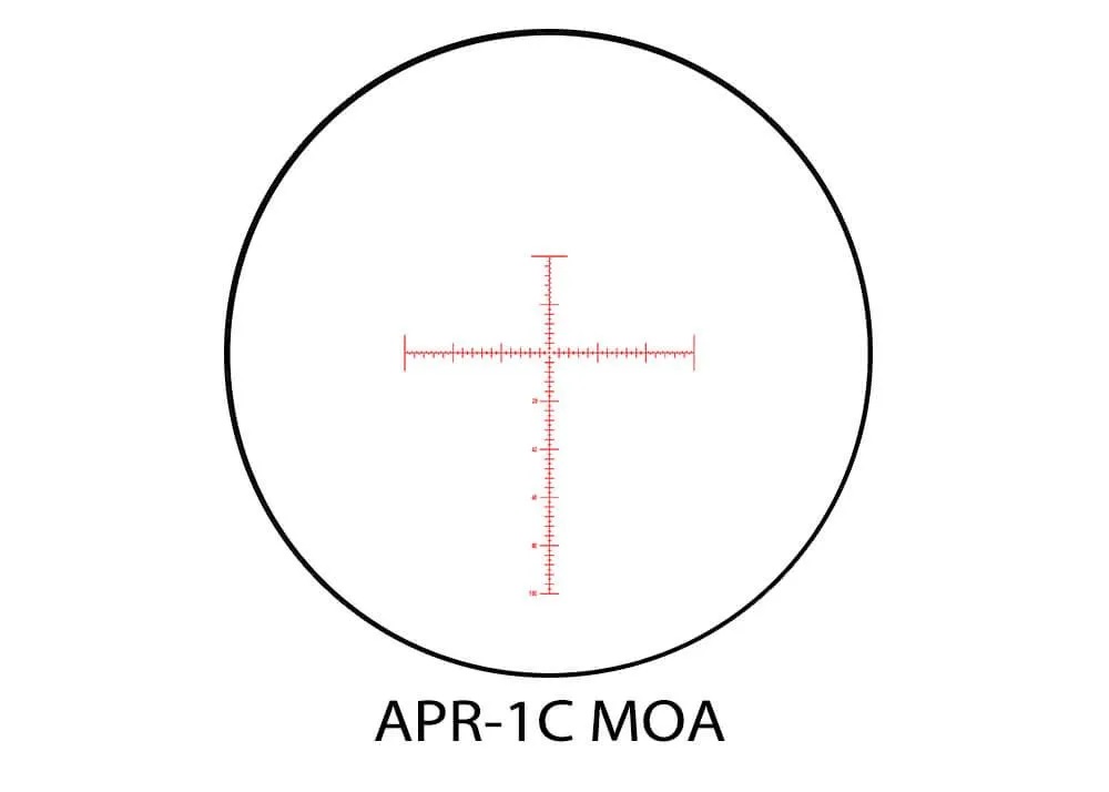 Furthermore, the sleek and lightweight construction of the Immersive Series 10×40 rifle scope provides a lot of mobility and ease-of-use. The included tilt-adjustable (0-80 MOA or 0-24 Mrad) unimount is accompanied by three mounting base lengths, catering to personal preference. The centre of the APR-1C reticle can be illuminated partially. The illumination can be turned on and adjusted to different levels of brightness via a push-button on the left turret. A CR2032 powers the illumination.
