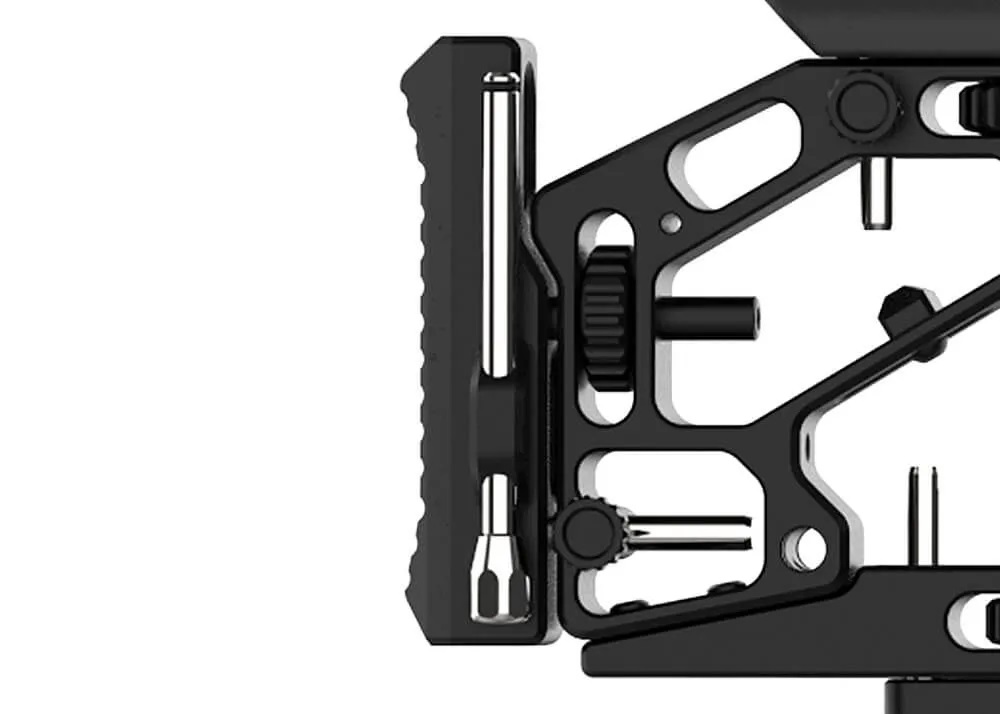 This adjustable monopod for the Two air rifle by Epic Airguns comes with an adapter to attach it to either side of the shoulder piece. Once attached, it can be adjusted vertically by loosening the adjustment wheel, to increase stability.