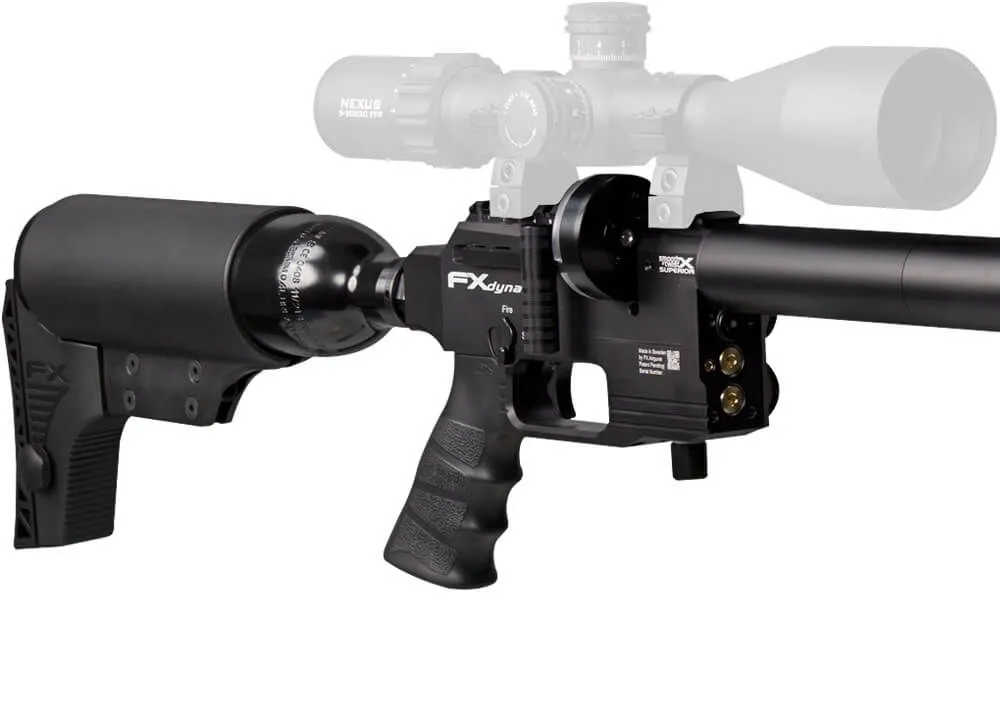 The FX Dynamic 600 VP is a high-performance air rifle inspired by the acclaimed FX Panthera, yet it boasts significant upgrades designed for the discerning shooter. Key enhancements include a larger air bottle, upgraded from 300 cc to 400 cc, and a redesigned stock and grip that elevate both functionality and comfort. The 400 cc bottle now connects directly to the action, offering increased shot capacity and more consistent performance. This integration, along with an adjustable shoulder piece, extends the rifle’s length by 40 mm compared to its predecessor. Additionally, the zero-angle grip has been replaced with an ergonomic AR-15 style angled grip for improved handling.