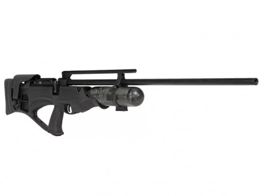 The Piledriver has been designed for big game hunting and has a big bore 838 mm rifled barrel for maximum precision at longer ranges. Still this rifle is fairly compact compared to its barrel, due to its Bullpup design. This makes the rifle user friendly and easy to operate. The bottle is equipped with a 480 cc bottle which gives you about 6 shots at full power (cal .45). In .30 this will be more. The bottle has a maximum working pressure of 300 bars, never exceed the advised fill pressure.