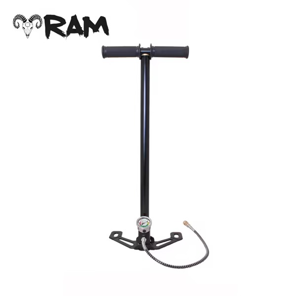 RAM Tactical PCP Pump, 300 bar, with hose, quick fitting, and foldable footrests for filling your air rifle. Oil free and a good exercise for your physical health.