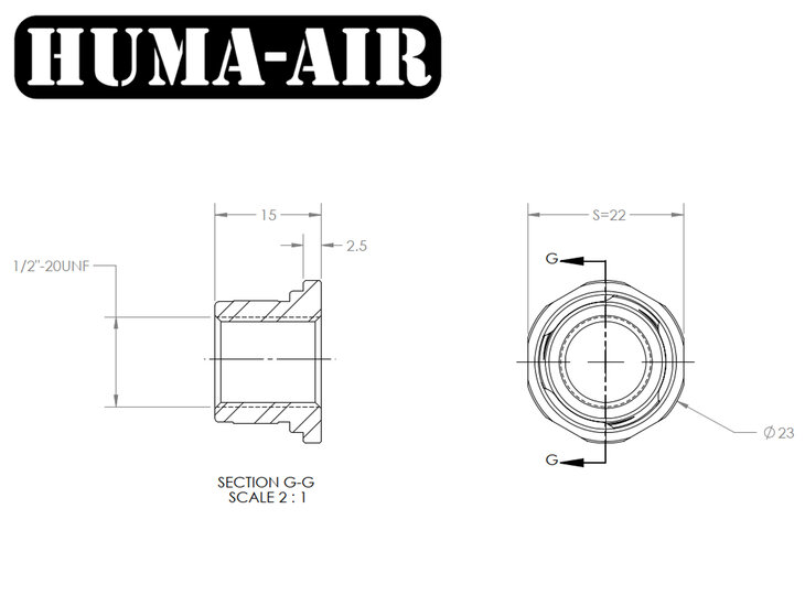 This barrel adaptor is specially designed for shrouded barrels with 1/2 UNF threads like for example FX Airguns. The outer diameter of the hexagon barrel part is 23 mm. Detailed dimensions are visible in the product images.