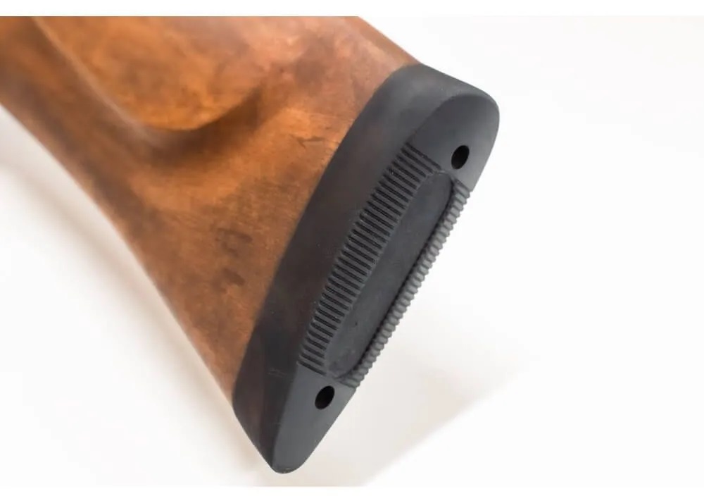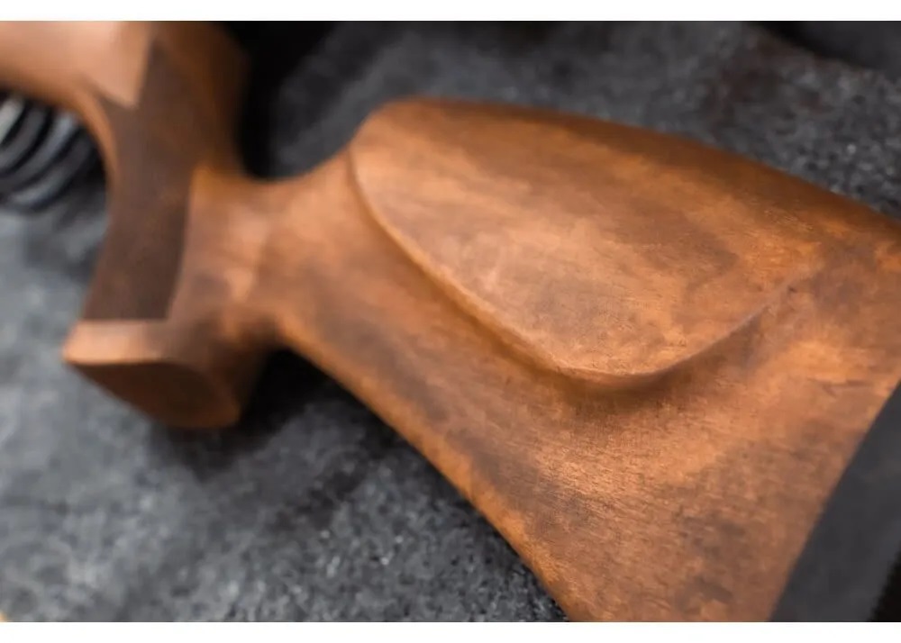 The smoothly shaped stock comes with laser engraved chequering on the grip and forend, for a nice and secure hold. To make shouldering more comfortable and to dampen recoil, the stock comes with a rubber butt pad. The underside of the forend features a manometer for the pressurised air reservoir.