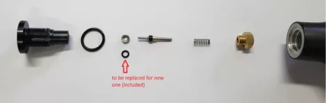 By replacing the red marked factory oring below, with the new o-ring (with a different size and hardness) what is included with the bottle adaptor, the valve seat will remain perfectly in it’s position during use and will seal properly.