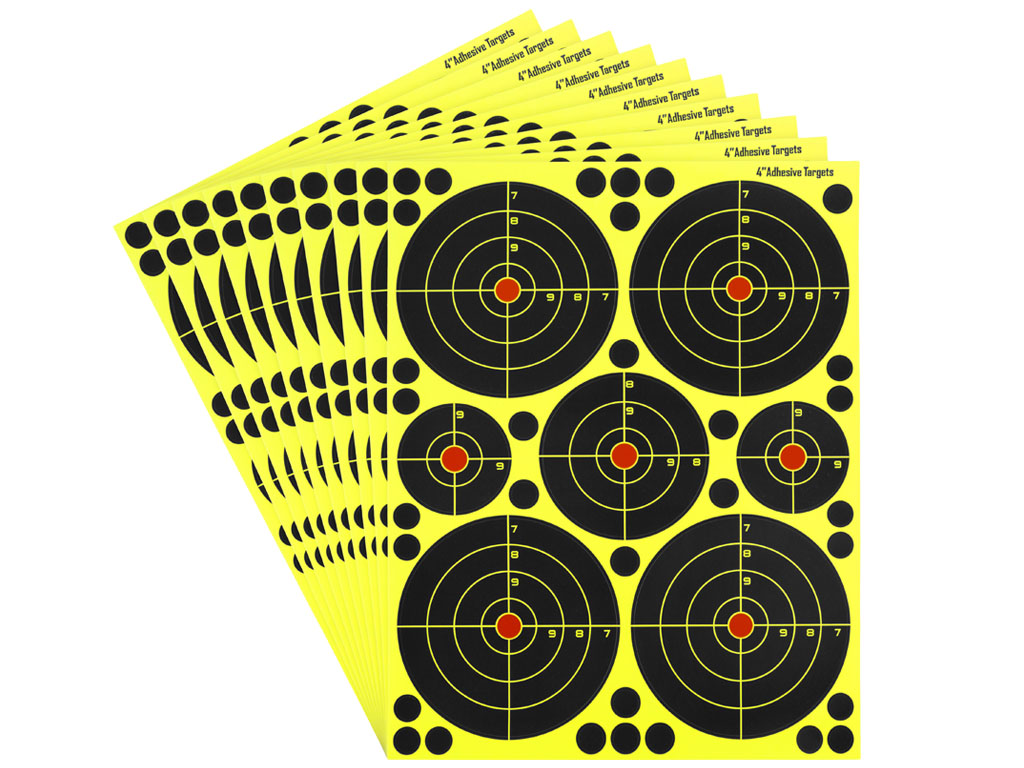 Target Sports Shooting Sticker Sheets. Package of 10 sheets. With per sheet 7 targets 4x 4″, 1x 3″, 2x 2″ and 32 target patches. When the target is hit the point of impact will be highly visible. Self adhesive